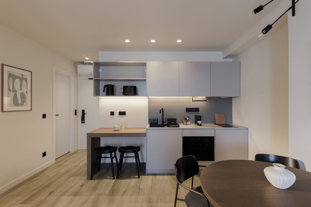 Equipados con cocinas completamente funcionales, cafetera, Wi-Fi de alta velocidad y televisores de pantalla plana, los apartamentos están preparados tanto para estancias cortas como prolongadas. Ya sea que viajes por trabajo o placer, aquí encontrarás todo lo esencial para garantizar una estancia cómoda y sin complicaciones en el corazón de Atenas.