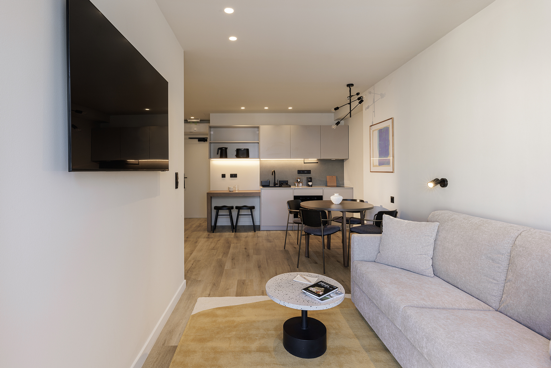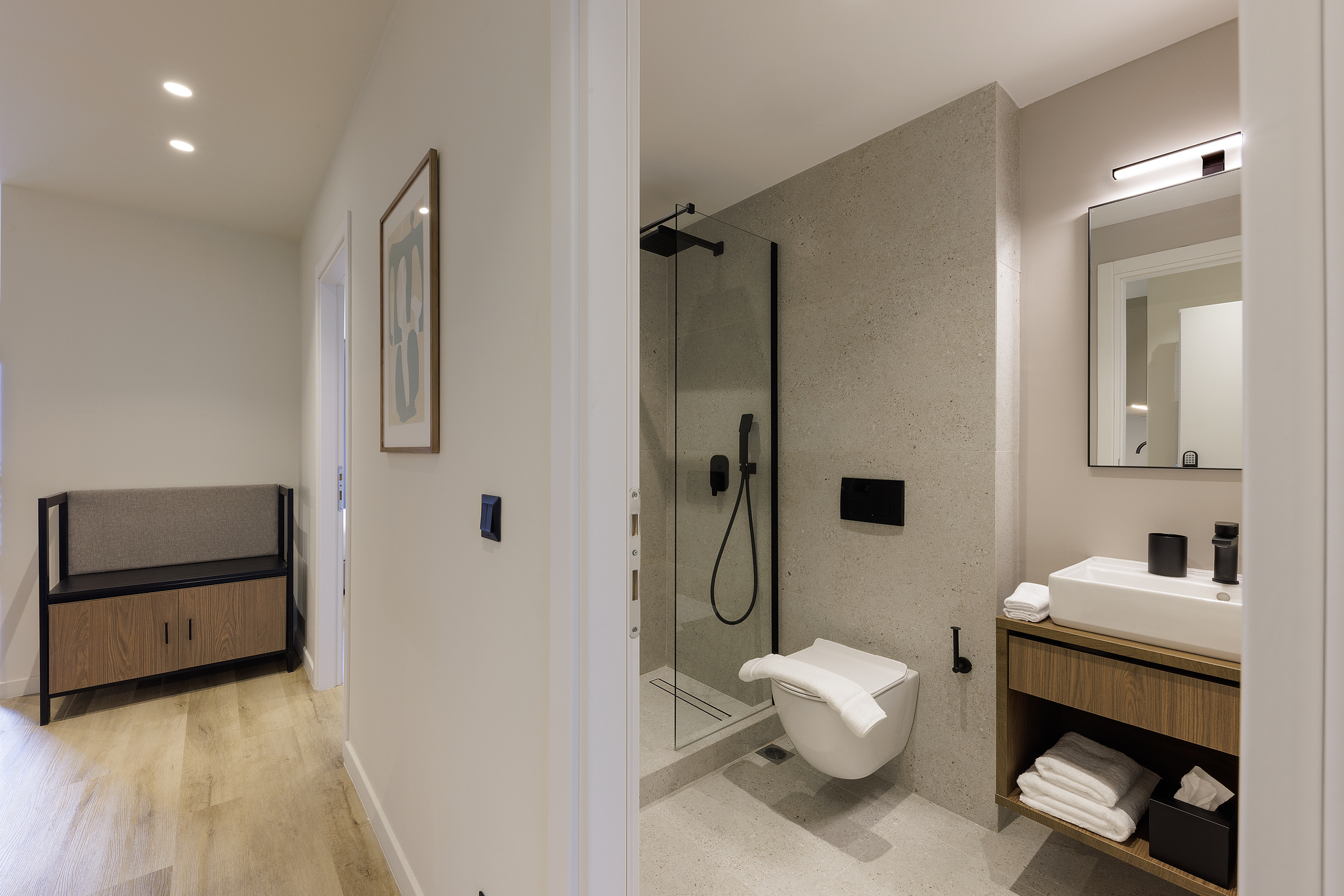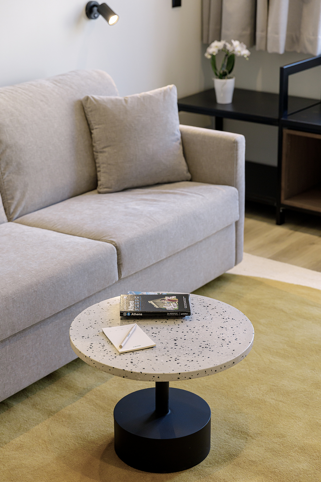 El apartamento de un dormitorio con balcón en master Plaka Atenas ofrece una estancia amplia y tranquila para hasta cuatro personas. Con 42 m², combina diseño minimalista moderno, tonos neutros y elementos funcionales para crear un refugio cómodo.