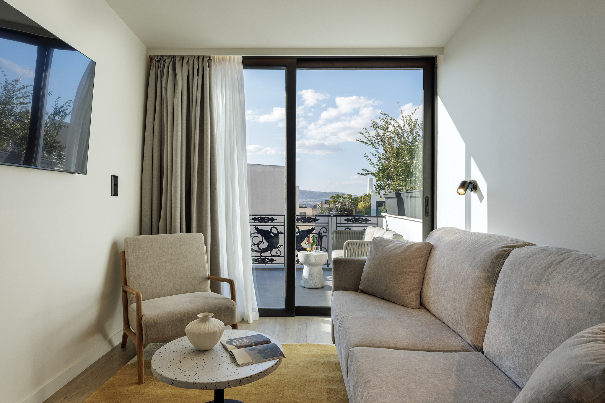Incluye un dormitorio independiente y un sofá cama en la sala de estar, lo que brinda flexibilidad para familias o pequeños grupos. El balcón privado es perfecto para disfrutar del animado ambiente de Plaka, uno de los barrios más pintorescos de Atenas.