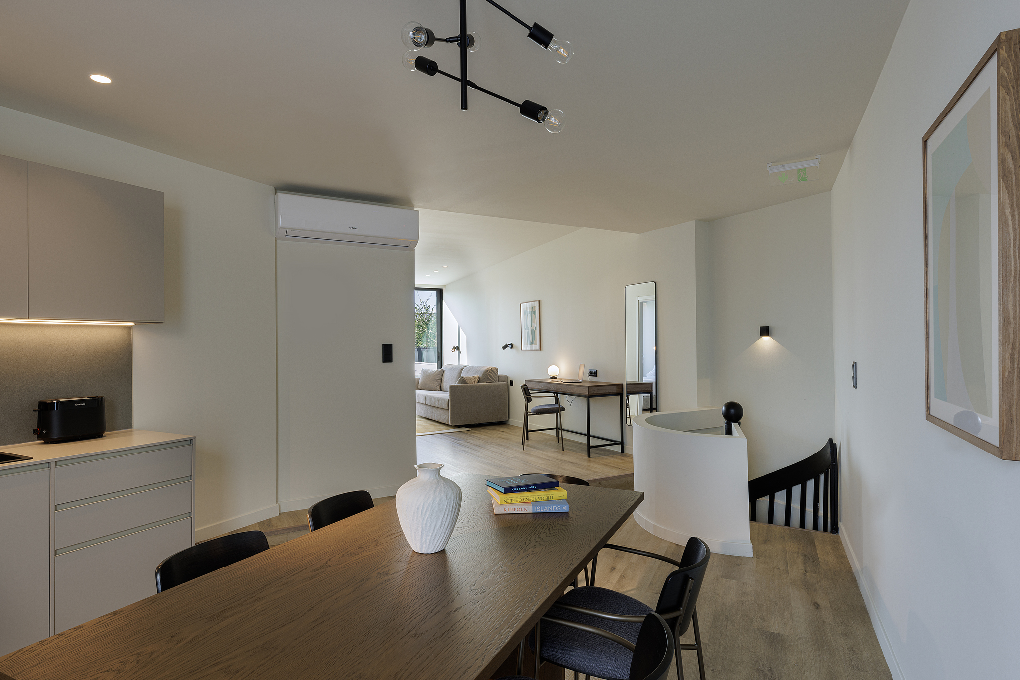 El ático de un dormitorio con balcón en master Plaka Atenas ofrece un refugio elegante y exclusivo para hasta cuatro huéspedes. Con 42 m² de espacio cuidadosamente diseñado, adopta un estilo minimalista moderno, con tonos neutros y elementos prácticos que garantizan una estancia serena y confortable.