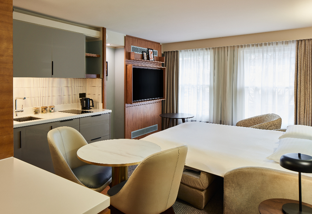 El apartamento incluye una cómoda zona de estar, una cocina totalmente equipada con lavavajillas, una disposición de descanso confortable y una televisión de pantalla plana para tu entretenimiento. El WiFi de alta velocidad te mantiene conectado, mientras que el diseño despejado y el almacenamiento integrado aportan practicidad y comodidad, convirtiéndolo en una opción ideal tanto para estancias cortas como prolongadas.