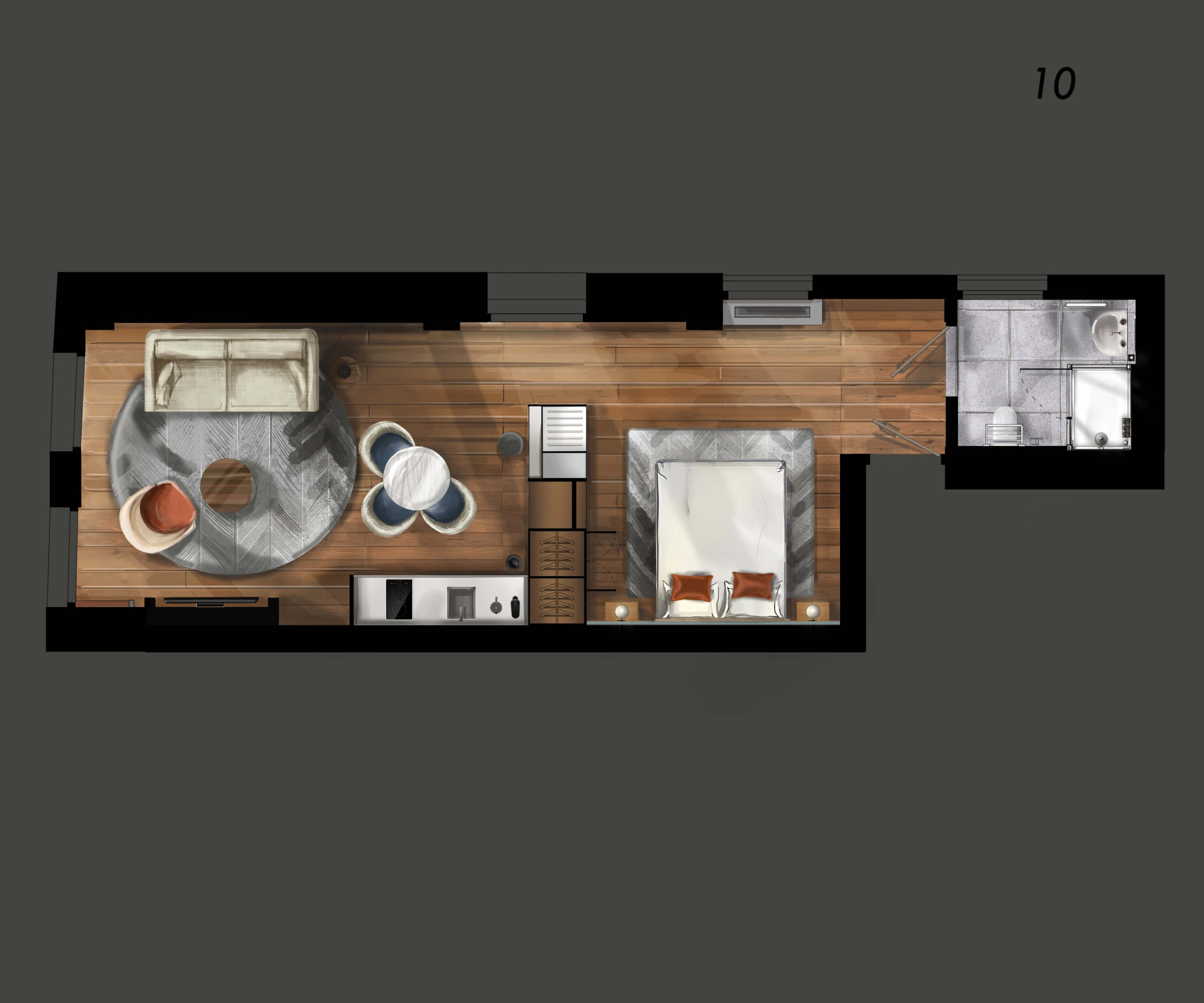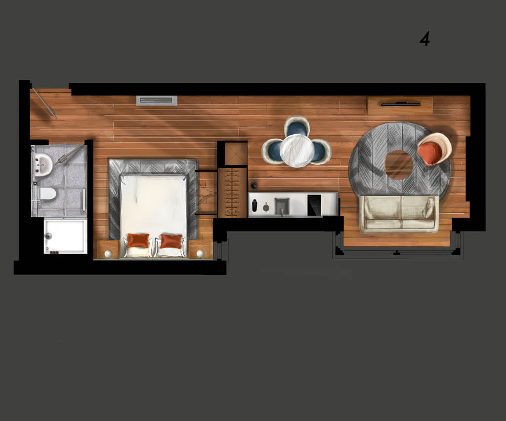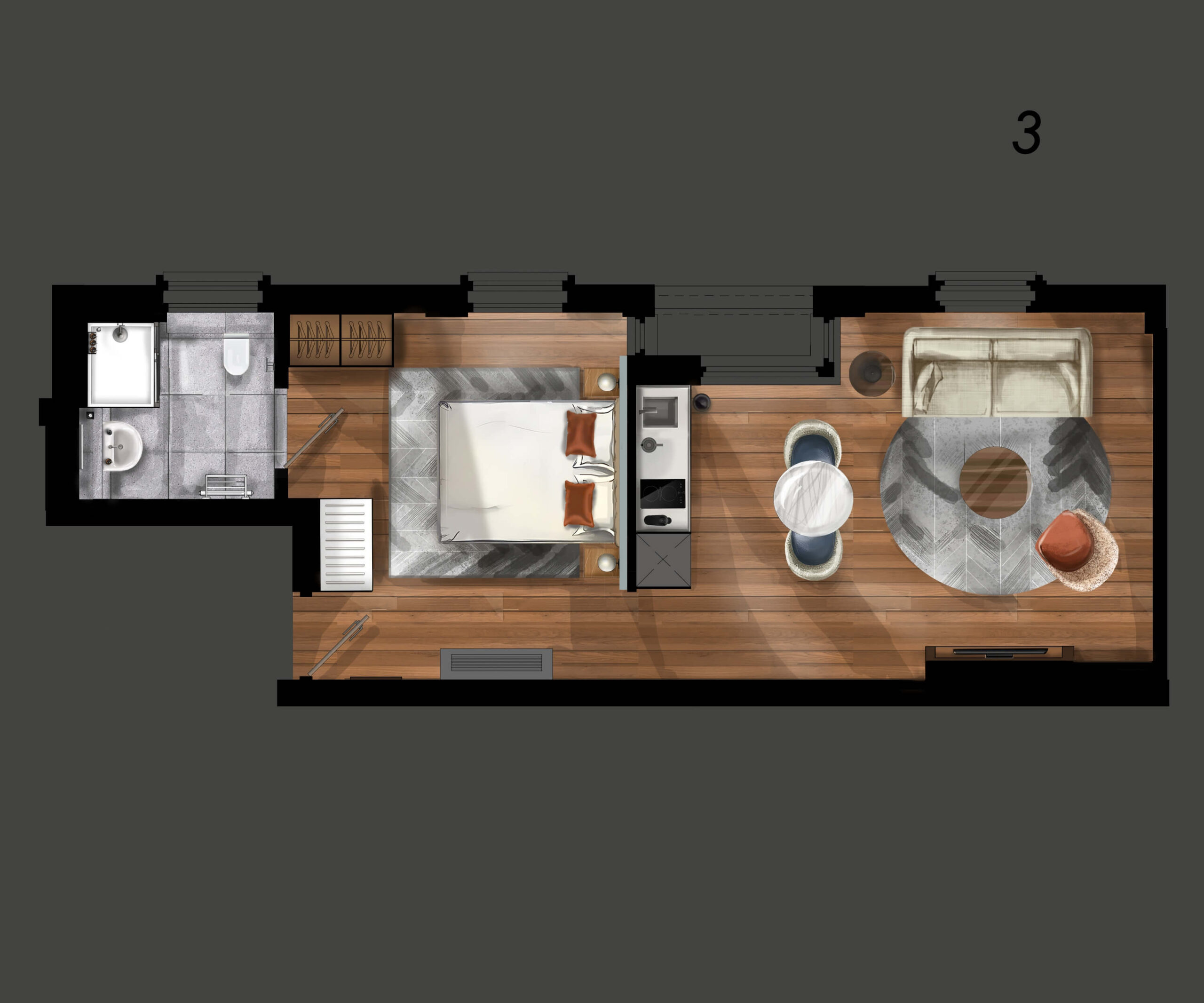 Este apartamento de 39 m² está diseñado para alojar hasta 4 personas, ofreciendo una combinación perfecta de estilo y funcionalidad. Su diseño moderno inspirado en mediados de siglo incorpora suaves tonos verdes, azules, colores tierra y madera natural, creando un ambiente cálido y acogedor.