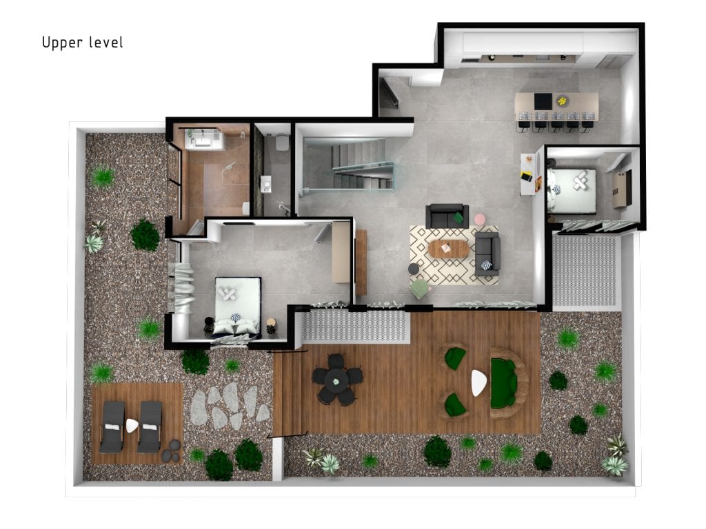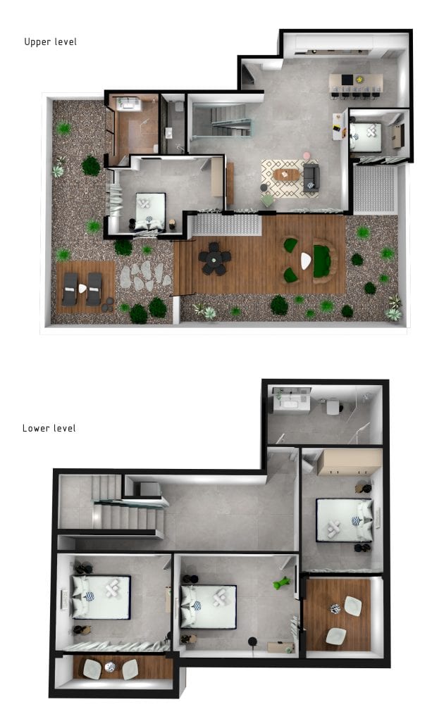 Nuestro apartamento dúplex con jardín de cinco dormitorios con servicios es un espacio perfecto para largas vacaciones en familia y estancias de negocios prolongadas. Sus serenos y elegantes 350 m² tienen capacidad para hasta 10 huéspedes. El patio privado es un oasis verde adornado con frondosa vegetación y plantas exóticas, con cómodas tumbonas en las que puedes disfrutar de cenas al aire libre o simplemente relajarte.